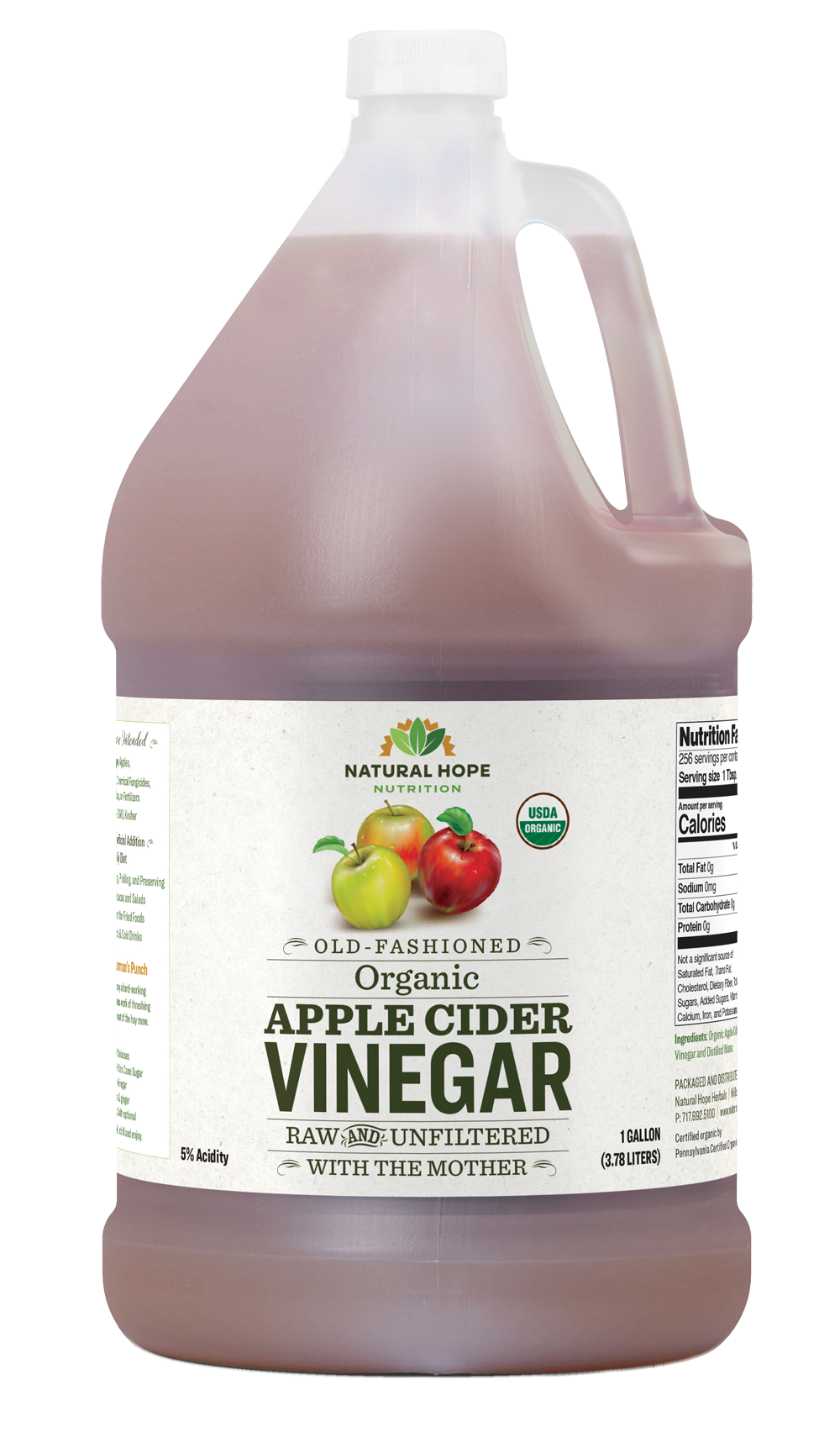 Natural Hope Herbals Raw Organic Apple Cider Vinegar is made from a delicious blend of apples raised using no chemical insecticides, fungicides, herbicides, or chemical fertilizers…it’s only natural!